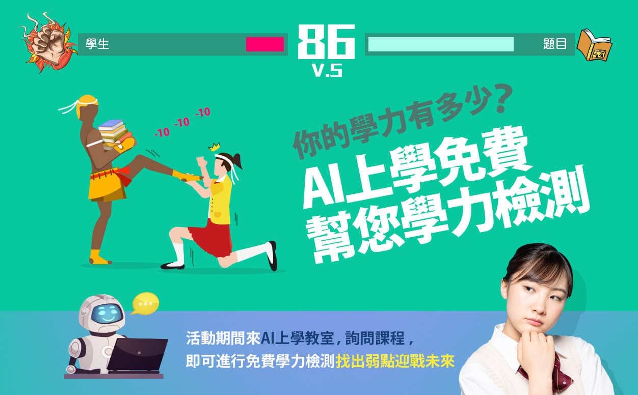 你的學力有多少?AI上學免費幫您學力檢測!活動期間來AI上學教室,詢問課程,即可進行免費學力檢測,找出弱點迎戰未來
